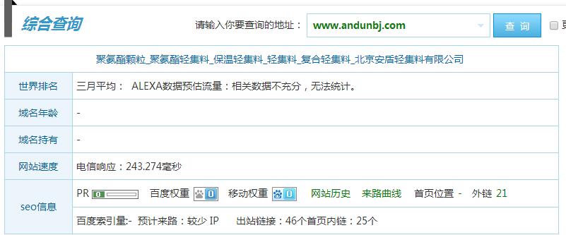北京安盾轻集料有限公司主要经营聚氨酯轻集料,聚氨酯颗粒,保温轻集料等,公司运用现代科学的管理手段,热忱为广大客户提供优秀的服务。今天北京SEO优化与大家做一下该公司网站优化的分析: